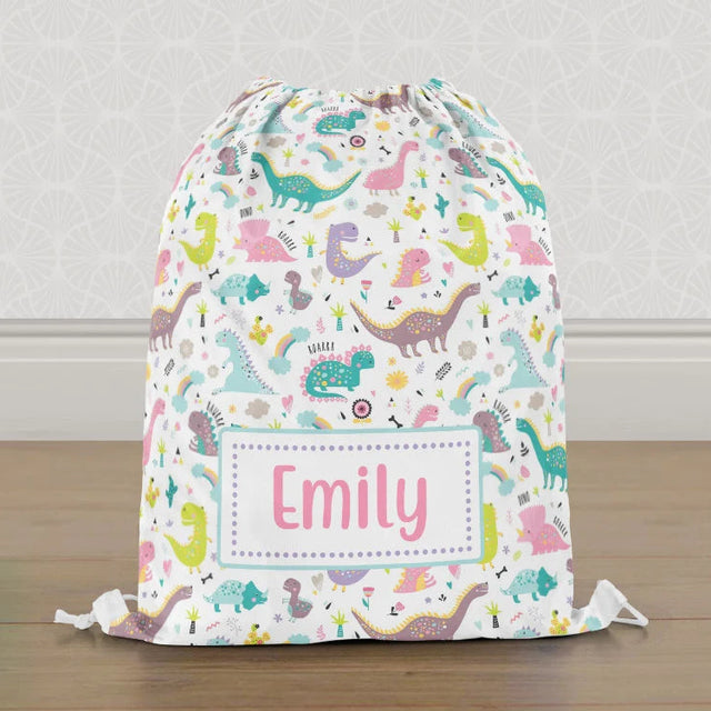 Get this cute personalised Dinosaur PE Bag, perfect for your little one’s school and sports adventures! Made with water-resistant fabric, it’s ready for any activity, swimming, football, tennis, and beyond. The vibrant, fun design makes it simple to spot in the school cloakroom. Keep all their essentials organised and ready with this handy drawstring bag, featuring a print on one side, a plain white back, and sturdy chunky strings for easy carrying.