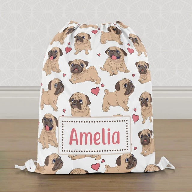 Get this cute personalised Pug PE Bag, perfect for your little one’s school and sports adventures! Made with water-resistant fabric, it’s ready for any activity, swimming, football, tennis, and beyond. The vibrant, fun design makes it simple to spot in the school cloakroom. Keep all their essentials organised and ready with this handy drawstring bag, featuring a print on one side, a plain white back, and sturdy chunky strings for easy carrying.